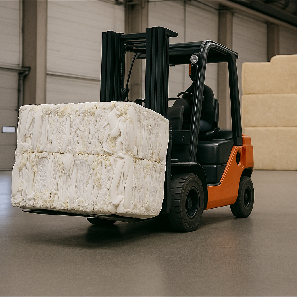 An unserem Standort betreiben wir mehrere leistungsstarke Ballenpressen, mit denen wir lose Schaumstoffreste effizient komprimieren und optimal für den Weitertransport vorbereiten. Darüber hinaus verfügen wir über umfassende Möglichkeiten zur Lagerung, Sortierung nach Farbe und Qualität, Neuverpressung und anschließenden Containerverladung für den Export.
